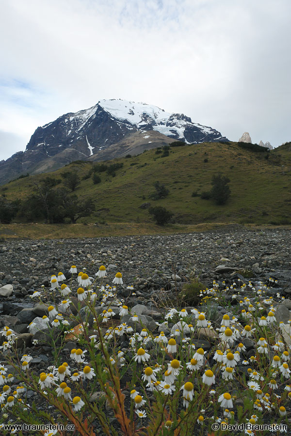 - krajina, krajinný celek, pohled, kytka, květina, hora, kopec, skalnatá, skalnatý, cizí zem, pohoří, cestopis, 20060107, květiny, kytky, cízí zem, chile, torres del paine, kopretiny, sníh